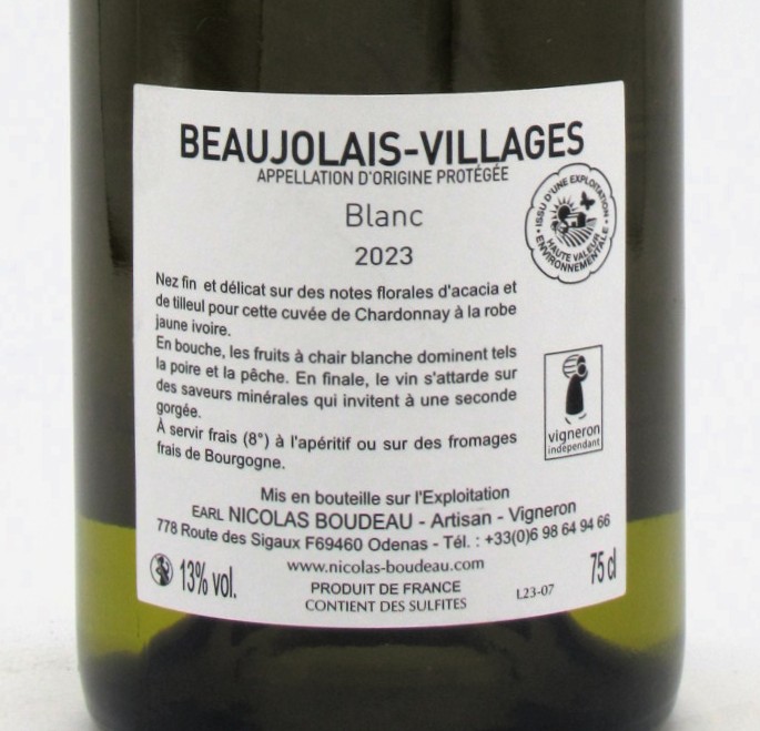 Le Beaujolais Village Blanc Domaine Nicolas Boudeau 2023 est composé de Chardonnay.
