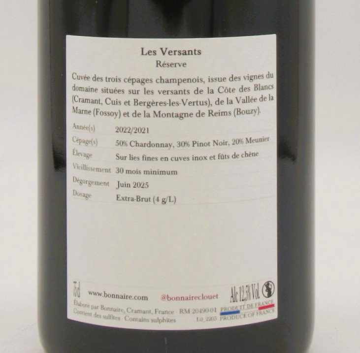Le Champagne Extra Brut Les Versants Bonnaire est un assemblage de 50 % Chardonnay, 30% Pinot Noir, 20 % Pinot Meunier.