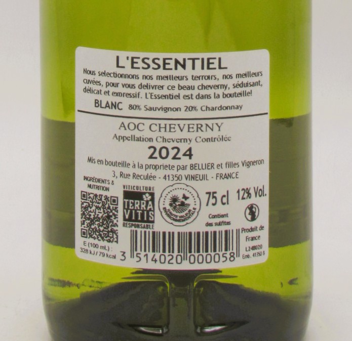 Le Cheverny Blanc Essentiel Domaine Bellier 2024 est composé de 80% de Sauvignon et de 20% de Chardonnay.