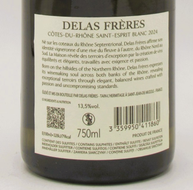 Le Cotes du Rhône Blanc Saint Esprit Maison Delas 2024 est un assemblage de Grenache blanc, Clairette, Bourboulenc et Viognier.