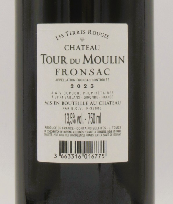 Le Fronsac Chateau Tour du Moulin Les Terres Rouges 2023 est composé de 100% de Merlot.