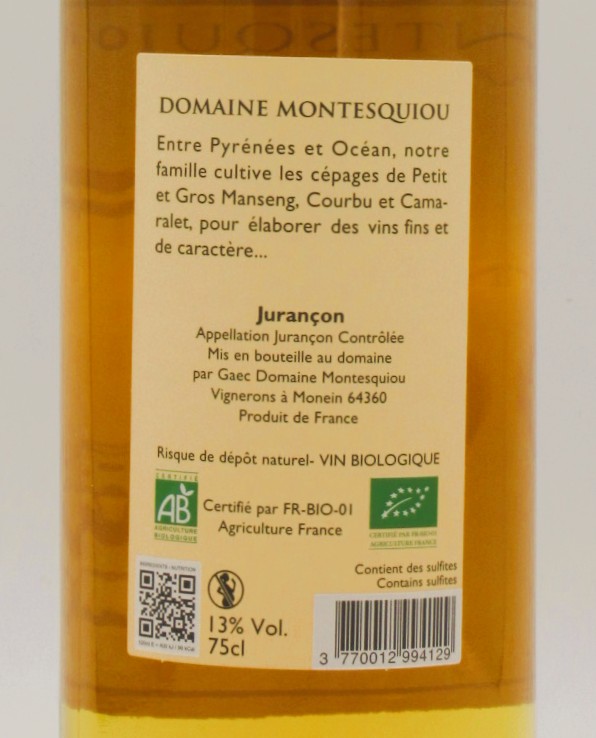 Le Jurançon Moelleux Bio Amistat Domaine de Montesquiou 2024 est un assemblage de Gros Manseng et de Petit Manseng.