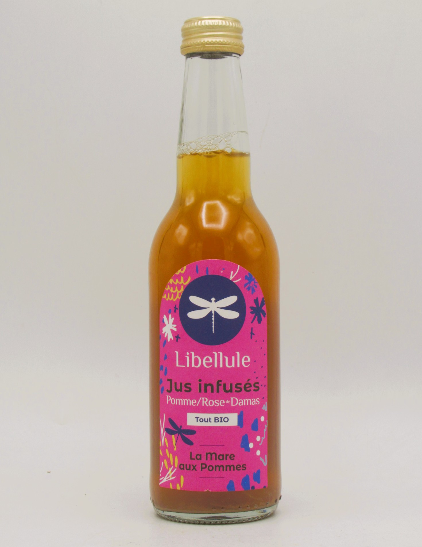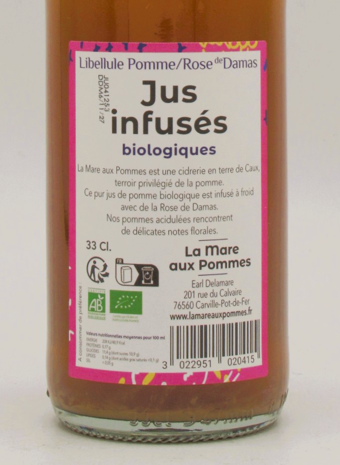 Le Jus Infusé Bio Libellule Pomme Rose de Damas La Mare aux Pommes est à produit à Carville Pot de Fer, près d’Yvetot en plein Pays de Caux.
