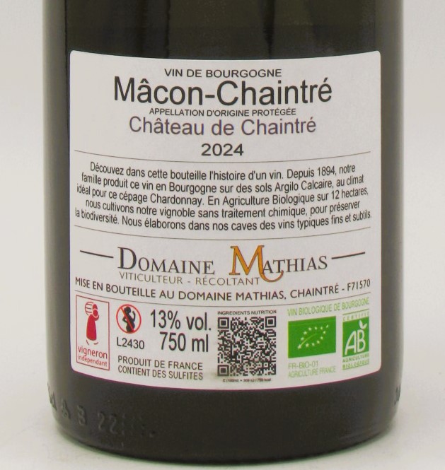 Macon Chaintre Bio Blanc Chateau de Chaintre Domaine Mathias 2024