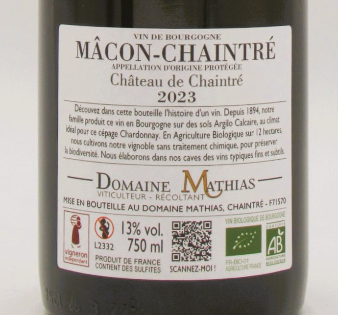 Le Bourgogne Macon Chaintre Bio Blanc Chateau de Chaintre Domaine Mathias 2023 Cuvée Chateau de Chaintre est composé de Chardonnay à 100%.