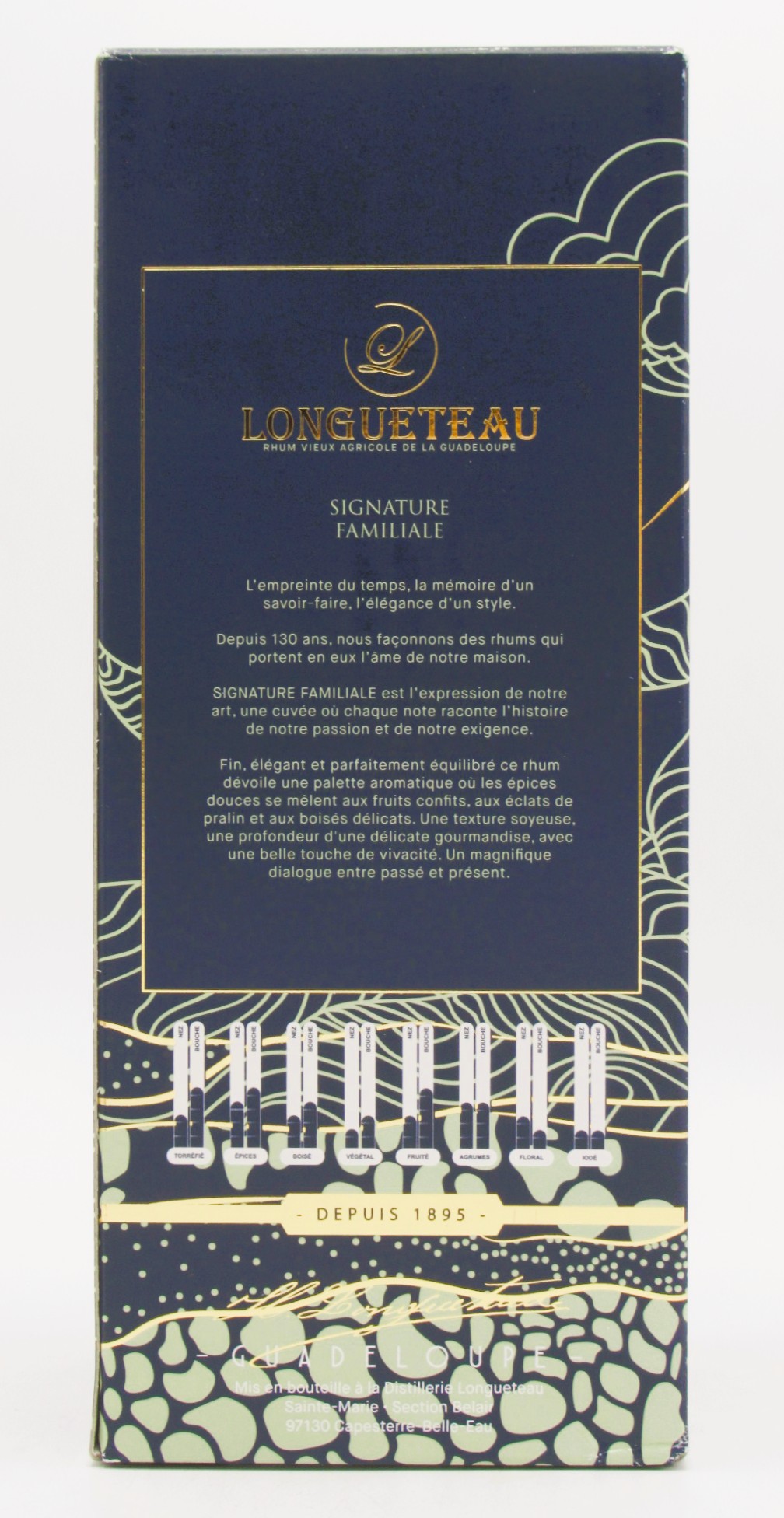 Le Rhum Vieux Longueteau Signature Familiale 130 ans est une Cuvée Edition Limitée marquant les 130 ans de la Distillerie de Guadeloupe Longueteau. Une Cuvée existe aussi en Rhum Vieux. Elle diffère des traditionnelles parcellaires par un assemblage de 2 millésimes.