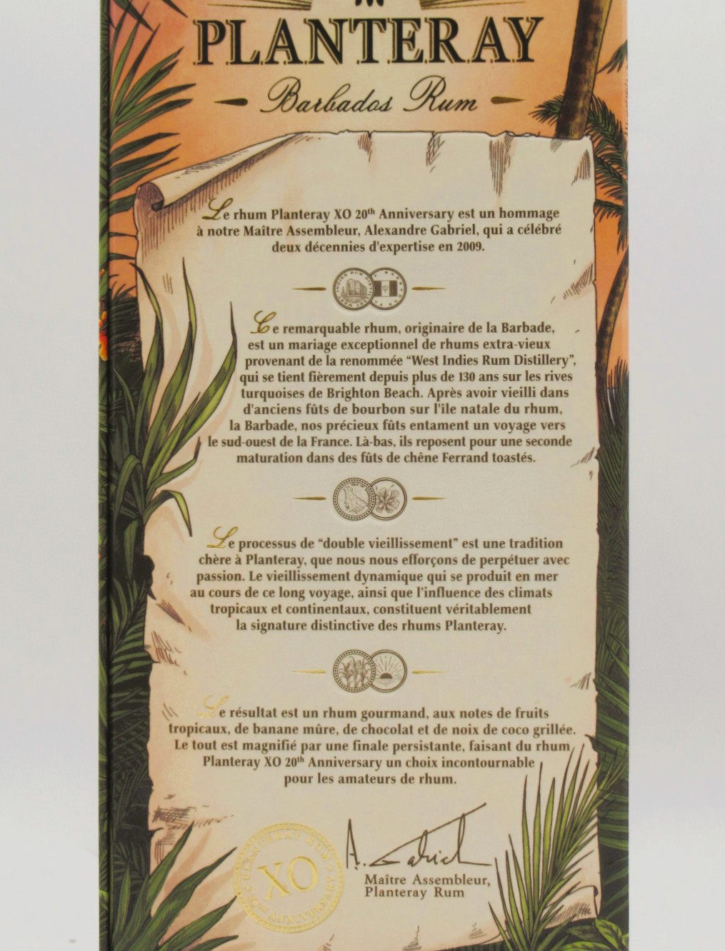 Distillation & Elevage : Cuvée extraordinaire créée pour célébrer la 20ème année d’Alexandre Gabriel en tant que Maître Assembleur des rhums Planteray, cet assemblage de rhums de 12 à 20 ans d’âge originaires de la Barbade reflète l’expression même de cette île. A l’instar des autres rhums Planteray, cette cuvée exotique a vieilli dans son pays d’origine, la Barbade, mais a également bénéficié des bienfaits du vieillissement à Cognac, dans des fûts originellement utilisés pour les cognacs Ferrand. L’assemblage minutieux est l’œuvre du Maître de Chai de Maison Ferrand, Alexandre Gabriel, selon les méthodes traditionnelles de la Barbade et de sa propre région.