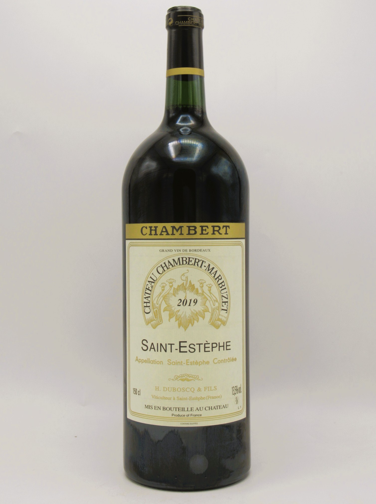 Le Saint Estephe Chateau Chambert Marbuzet 2019 Magnum est un assemblage de Cabernet Sauvignon (70%) et de Merlot (30%)