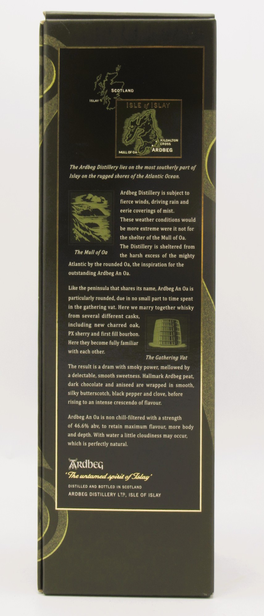 Distillation & Elevage : Edition permanente de la distillerie Ardbeg, l’expression An Oa (prononcez An Oh !) renferme tous les contrastes de ce lieu sauvage où les tempêtes et le calme ne font qu’un. Comme cette péninsule, Ardbeg An Oa est remarquablement rond. Ceci est dû à son passage dans une cuve de collecte mise au point spécialement par Ardbeg pour An Oa, au cœur d’une salle bien particulière de la Distillerie : la salle d’assemblage sur-mesure. Des whiskies issus de trois maturations différentes y sont assemblés. L’un vieilli en fûts de Pedro Ximenez fait la douceur d’Ardbeg An Oa, l’autre en fûts de chêne carbonisés apporte ses notes épicées et le dernier, vieilli dans d’anciens fûts de Bourbon, lui procure une belle intensité. Il en résulte un whisky unique, singulièrement rond dont les notes fumées sont nuancées par une remarquable douceur. Son caractère est aussi contrasté que le lieu sauvage dont il tire son nom, avec toute la puissance et l’intensité d’Ardbeg.