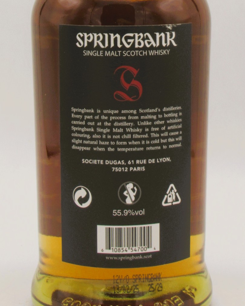 Le Single Malt Scotch Whisky The Springbank 12 Ans est une cuvée Brut de Fût, en Edition limitée, millésime 2024.