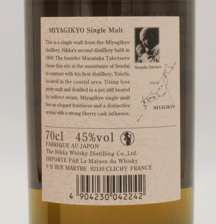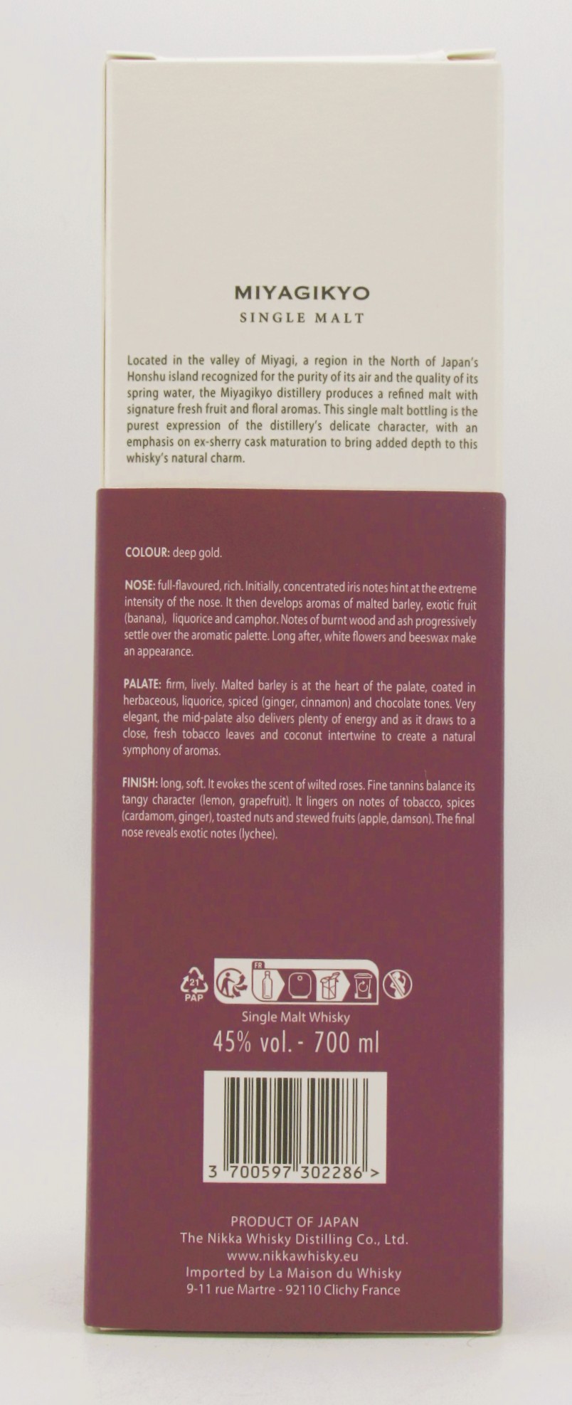 La Propriété : Située dans la vallée de Miyagi, une région au nord de l’île de Honshu reconnue pour son air pur et la qualité de ses eaux de source, la distillerie Miyagikyo de Nikka produit un malt raffiné avec une fraicheur fruitée et florale immédiatement reconnaissable.Profil : ferme et ample. Orge maltée, épices douces, chocolat, cire et noix de coco.