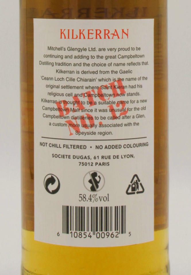 La Propriété : Kilkerran est l’un de ces whiskies écossais qui ne porte pas le nom de sa distillerie, Glengyle. Ils ne sont pas si nombreux que cela, heureusement car cela peut porter un peu à confusion, n’est-ce pas ? Fondée en 1872 et mise en sommeil en 1925, la distillerie est revenue à la vie dans des circonstances un peu rocambolesques. Rappel des faits. En 1998, la Scotch Whisky Association (qui régit l’appellation Scotch) envisage de rayer Campbeltown – l’une des six régions de production écossaises – des tablettes. Le motif ? Deux distilleries – Glen Scotia et Springbank – ne suffisent pas à former une catégorie à part entière. Il en faut au moins trois, comme dans les Lowlands. Et c’est ainsi que Hedley Wright, le propriétaire de Springbank, décide de réactiver Glengyle en mars 2004, dont il avait racheté le bâtiment et le matériel restant en 2000. Seul souci, la marque de whisky n’appartient plus à la distillerie, les embouteillages porteront donc le nom de Kilkerran. Toutes les opérations sont menées par le personnel de Springbank, qui s’occupe également du maltage de l’orge sur son aire de maltage. La distillerie Glengyle pratique des fermentations longues, de 80 à 100h et est équipée de deux alambics à repasse. Sa capacité théorique annuelle est de 750 000 litres d’alcool pur (l’équivalent d’un peu plus de 2,5 millions de bouteilles) mais en réalité, Glengyle produit seulement 30 000L par an (moins de 100 000 bouteilles de 70cl à 46%). Une première édition limitée a vu le jour en 2007. Et depuis 2009, c’est la série des Work In Progress (WIP) qui a pris le relais. Depuis 2013, deux WIP sont commercialisés chaque année (une dizaine de milliers de bouteilles en ex-fût de xérès, moitié moins en ex-fût de bourbon). Ces embouteillages ont pour but de faire patienter l’amateur jusqu’en… 2016, date de sortie du premier 12 ans d’âge. Nous y voici donc : le lancement de ce premier compte d’âge issu de single malt de 12 ans vieillis en fûts de bourbon et en fûts de xérès marque le vrai retour de Glengyle sur le devant de la scène. Un évènement à ne pas manquer !