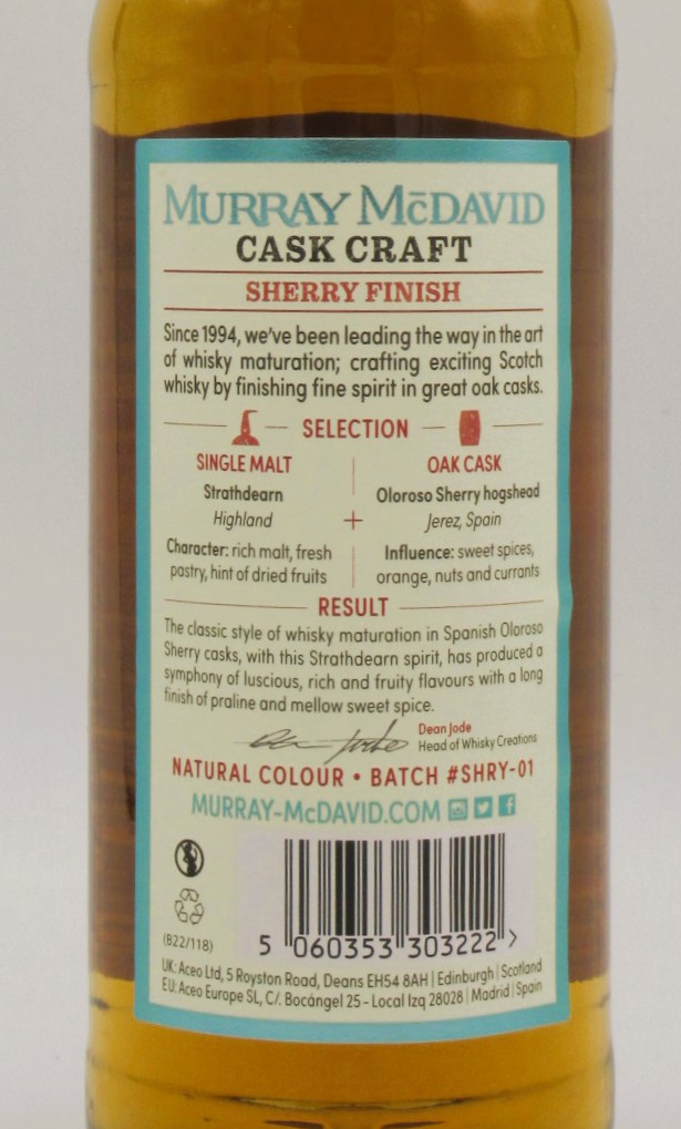 Ce Single Malt Whisky Strathdearn Distillery Sherry Finish Murray Mc David , a été vieilli en ex-fût d’Oloroso Sherry hogshead, Jerez, Espagne .