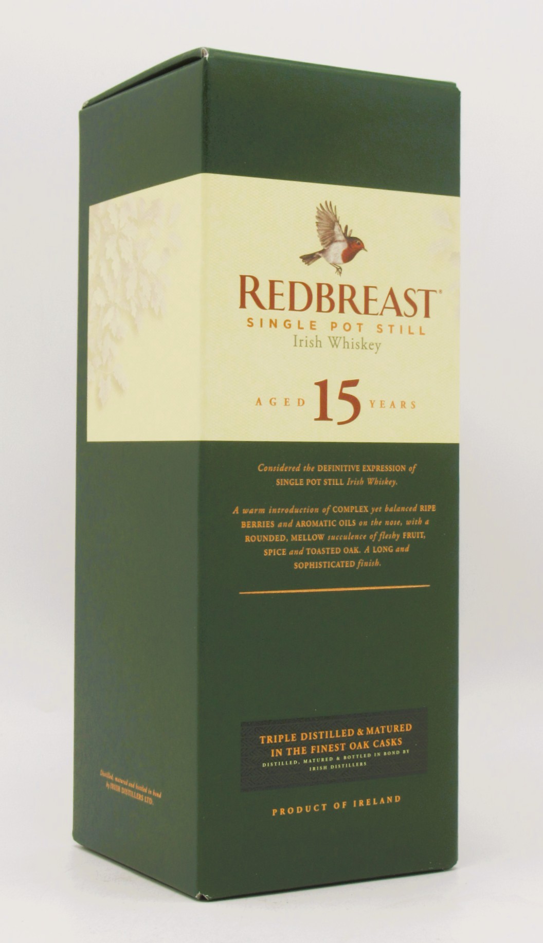 Fin 2005, la distillerie Midleton a embouteillé pour la première fois de son histoire un Single Pot Still Irish Whiskey Redbreast 15 Ans. Cette édition limitée avait fait à l’époque beaucoup de bruit. La distillerie a donc décidé d’intégrer ce super Single Pot Still Whiskey dans sa gamme permanente. Il reprend la même base que le magnifique Redbreast 12 ans mais est plus complexe avec la noix de coco, l’iris et la fève de cacao en plus.